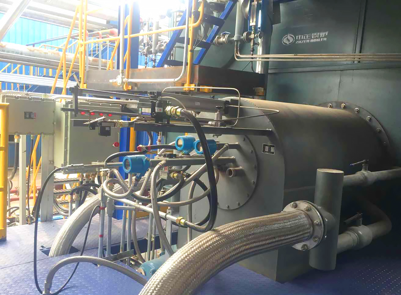 濰坊某石化企業(yè),原有一臺(tái)20t臥式蒸汽爐,燃料為富氫氣,工藝線(xiàn)產(chǎn)出沼氣直接通過(guò)地面火炬燃燒,造成資源的浪費(fèi)。我公司根據(jù)鍋爐參數(shù)與燃料參數(shù),定制化設(shè)計(jì)一套混燒燃燒器系統(tǒng),兩種燃?xì)猓ǜ粴錃狻⒄託猓┛赏瑫r(shí)進(jìn)行混燒或單燒,同時(shí)配置一套全新沼氣閥組與控制系統(tǒng),經(jīng)我方工程師調(diào)試后,燃燒器運(yùn)行平穩(wěn),滿(mǎn)足用戶(hù)兩種燃?xì)饣鞜募夹g(shù)要求。